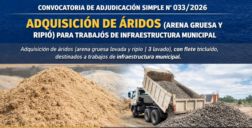 Objeto: Adquisición de áridos (arena gruesa lavada y ripio 1:3 lavado), con flete incluido, destinados a trabajos de infraestructura municipal.
