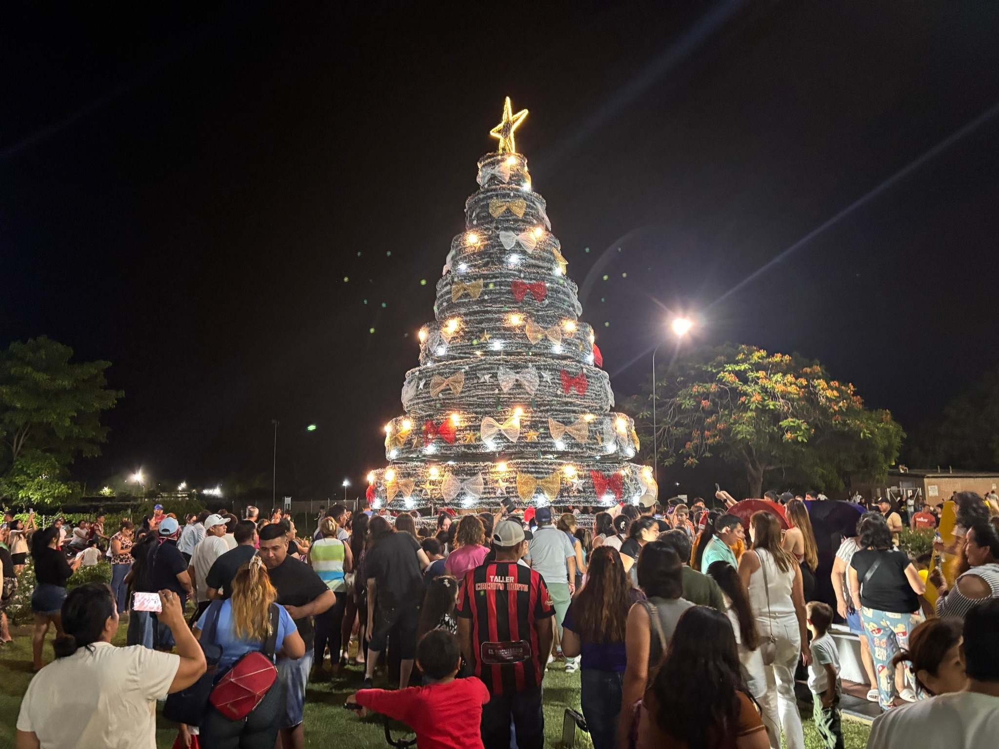 En un cálido marco de espíritu navideño, una multitud de vecinos acompañó el encendido del arbolito de Navidad en la rotonda del Acceso Sur, sobre Plaza Eduardo Arias.